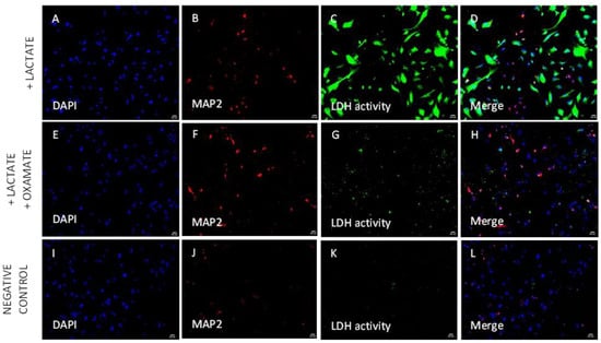 As shown in Figure 7, LDH activity is possible to detect in single fixed cells (neurons or glial cells). Total numbers of cells were identified by staining the nuclei of the cells (Figure 7A,E,I), neurons were marked by a specific neuronal-cytoplasmic marker MAP2 (Figure 7B,F,J), the green signal in the cytoplasm of the cells signifies the LDH activity per cell (Figure 7C,G,K), and the combination of all the signals can be observed in Figure 7D,H,L. In Figure 7A–D, we detect LDH activity in each individual cell when the substrate (lactate) was added to the detection reaction (Figure 7D). In the presence of oxamate (Figure 7E–H), a competitive inhibitor of LDH enzyme, the efficiency of the enzyme was substantially lower (compared with the image Figure 7D), showing a low number of positive cells for LDH activity (Figure 7H). In Figure 7I–L, we do not detect LDH activity. There is no LDH activity in our system in the absence of substrate (negative control, Figure 7L).