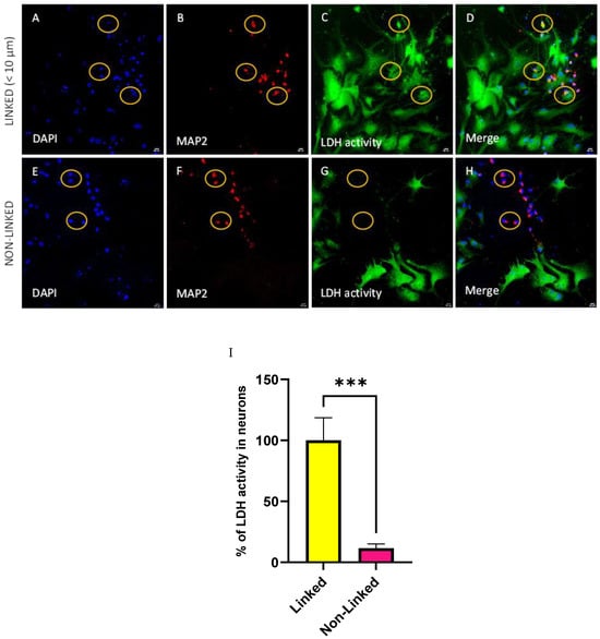 In Figure 8, we detected LDH activity in individual fixed neurons. Cellular nuclei were identified by DAPI staining (Figure 8A,E), MAP2 was used to specifically identify the neurons (Figure 8B,F), LDH activity per cell was measured via a redox reaction with nitro blue tetrazolium chloride (Figure 8C,G), and in the merged images in Figure 8D,H, all signals were combined. Figure 8A–D show that neurons in close distance to glial cells (<10 µm) have the highest LDH activity (Figure 8C). These neurons were named by our group as linked neurons (Figure 8B,D). On the other hand, the neurons that are far away from glial cells at larger distances than >10 µm (Figure 8E–H, non-linked neurons) present a lower LDH activity (Figure 8G,H) in comparison to Figure 8C,D. In the merged figures, it is possible to confirm the colocalization between the LDH-positive signal and MAP2 in linked (Figure 8D) and in non-linked (Figure 8H) neurons. The result was quantified in terms of percentage LDH activity in linked and non-linked neurons. The linked neurons have a statistically significantly higher LDH activity compared to the non-linked neurons (Figure 8I). Comparison between live linked and non-linked neurons cultured in glucose or lactate medium is in Supplementary Figures S3 and S4.