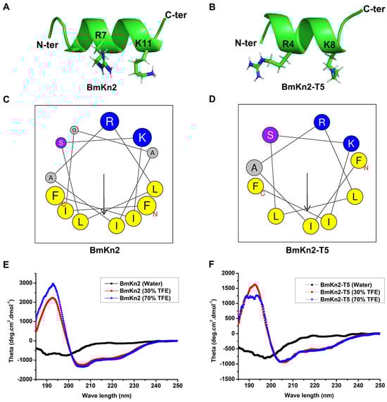 Analysis of BmKn2 and BmKn2-T5 structural characteristics. (A,B) Three-dimensional structures of BmKn2 and BmKn2-T5 obtained using I-TASSER. (C,D) Helical wheel plots of BmKn2 and BmKn2-T5 obtained using the HeliQuest server. In the helical wheel plots, arrows represent the direction of summed vectors of hydrophobicity, and residues marked in blue and yellow represent positively charged alkaline and hydrophobic amino acids, respectively. Meanwhile, the residue marked in purple represents Ser, and residues marked in gray represent Gly and Ala. (E,F) CD spectrum analysis of BmKn2 and BmKn2-T5. The CD spectra were recorded in water, 30% TFE, and 70% TFE solutions, respectively. N-ter, N-terminus; C-ter, C-terminus.