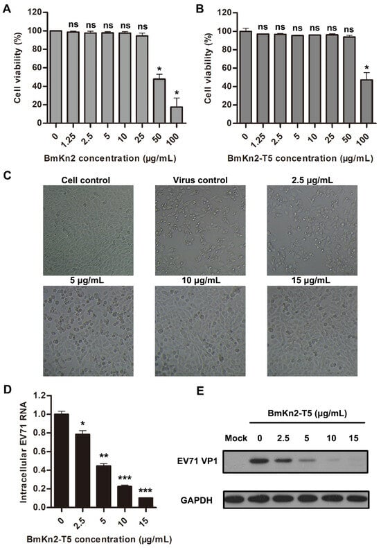 Dose-dependent antiviral effect of BmKn2-T5 on EV71 in RD cells. Cytotoxicity of (A) BmKn2 and (B) BmKn2-T5 in RD cells. The cell viability of RD cells treated with different concentrations of BmKn2 and BmKn2-T5 was measured using an MTS assay. (C) Inhibitory activity of BmKn2-T5 with different concentrations to EV71-induced CPE in RD cells. RD cells infected with EV71 at an MOI of 1 were treated with different concentrations of BmKn2-T5, and the morphology of RD cells was recorded at a magnification of 100× at 24 h post-infection. Dose-dependent inhibitory effect of BmKn2-T5 on EV71 analyzed using (D) qRT-PCR and (E) Western blotting. Data are presented as the means ± SD from three independent experiments (ns, not significant; *, p < 0.05; **, p < 0.01; ***, p < 0.001). Original images of (E) can be found in Figure S1.