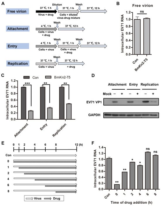 Effect of BmKn2-T5 on different stages of EV71 life cycle. (A) Schematic diagram for studying the action stage of BmKn2-T5 on EV71. (B) Effect of BmKn2-T5 on EV71 free virion in RD cells. EV71 attachment, entry, and replication in RD cells detected using (C) qRT-PCR and (D) Western blotting. (E) Schematic diagram of BmKn2-T5 treatment for different time points on EV71 infection. (F) Effect of BmKn2-T5 added for different time points on EV71 infection. RD cells infected with EV71 were incubated with 10 μg/mL BmKn2-T5 for the indicated times, and intracellular EV71 RNA was analyzed using qRT-PCR at 12 h post-infection, respectively. Data are presented as the means ± SD from three independent experiments (ns, not significant; *, p < 0.05; **, p < 0.01; ***, p < 0.001). Original images of (D) can be found in Figure S2.