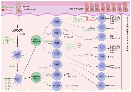 - Hu, P.; Wang, M.; Gao, H.; Zheng, A.; Li, J.; Mu, D.; Tong, J. The Role of Helper T Cells in Psoriasis. Front. Immunol. 2021, 12, 788940. [Google Scholar] [CrossRef]