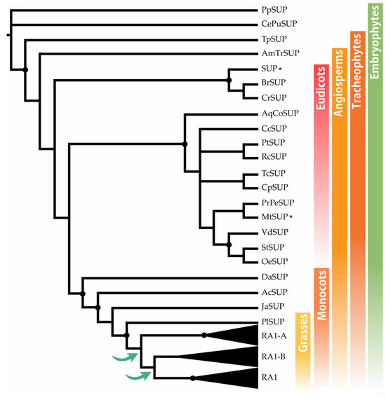 We identified that SUP was present, at least, from the early diversification of embryophytes (land plants). Based on such results we reconstructed the evolutionary history of SUP/RA1 in embryophytes. The phylogeny presented here suggests that RA1 arose from two successive duplications of SUP occurred at the diversification of the BOP and PACMAD clades. The first duplication gave rise to the RA1-like A lineage that is sister to the paralogs RA1-like B and RA1 lineages. The phylogeny is also supported here by genome synteny studies. Indeed, the previous literature and the collinearity analysis presented in this work suggest that both duplications may correlate with GD that occurred at the base of BOP/PACMAD separation (at ~80 million years ago) [48,49,50]. Interestingly, RA1 and RA1-like paralogs genes are exclusive of grasses and show different patterns of retentions and losses, as is usually observed after genome duplication events [48,49,50]. It is well documented that differential gene loss or subfunctionalization and neofunctionalization of retained copies, as the case presented here, may promote morphological, physiological, and ecological diversification, in particular, in grasses [51,52].