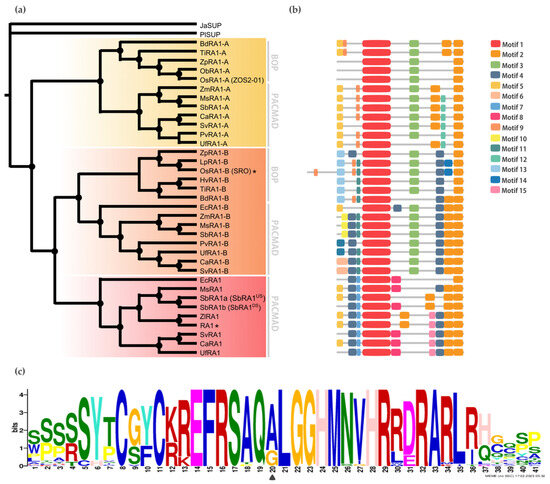 To gain resolution on the relationship between RA1 and RA1-like, we reconstructed a new phylogeny with amino acid sequences obtained from 16 genomes of grass species using as an outgroup the SUP sequence from the monocot J. ascendence (Figure 2a, Figures S2, and S3). The obtained tree topology suggests the possibility that (1) RA1 was originated after a second duplication around the split of the BOP and PACMAD clades, (2) RA1 is sister to the RA1-like B proteins, (3) RA1 was lost in the BOP clade and currently is present in the PACMAD clade, (4) RA1-like A and RA1-like B are found in species of both BOP and PACMAD clades, and (5) species-specific duplications and loss of some copies of RA1 and RA1-like suggest a complex evolution of these molecules during the diversification of the grasses (Figure 2a and Figure S4). Overall, SUP, RA1, and RA1-like are single-copy genes, except for the two RA1 variants found in S. bicolor, as previously described [2] (Figure 2a).