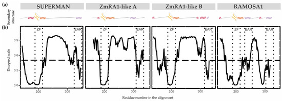 Figure 4. Protein secondary structure and conformational plasticity. (a) Secondary structure prediction of SUP, ZmRA1-like A, ZmRA1-like B, and RA1 proteins obtained by PsiPred server. α-helix corresponding to the zinc finger domain is represented in orange. α-helix corresponding to Motif 2, putative EAR motif, is represented in violet. Other α-helices are represented in pink. β-strands are represented in yellow. (b) Relative disorder levels of the structures measured in a range of 0 to 1.0 (Figure S10 and Table S4). Levels above 0.5 (dashed line) are considered disordered regions. Abbreviations: ZF, zinc finger domain; EAR, EAR repressor motifs.