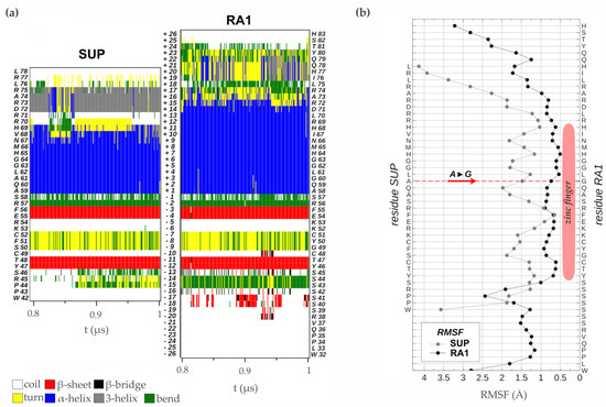 Figure 5. Zinc finger molecular dynamics simulation. (a) Time evolution of the secondary structure of SUP and RA1 proteins as determined by the DSSP algorithm using the simulated structures in the thermodynamics equilibrium interval (0.8 to 1.0 μs). At the side of the graph, the amino acid sequences are quoted with their residue number in the proteins. In the center of the graph, the relative position of each residue in reference to the first one of the α-helix N-terminal is indicated. (b) RMSF of the backbone atoms of each amino acid sequence in the equilibrium interval (0.8 to 1.0 μs), taking as reference for fitting the structures the one with smallest RMSD in the same period.
