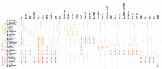 When the promoter of RA1 and RA1-like genes of 16 grass species were examined, many regulatory motifs were identified and grouped into 33 types of elements, according to the corresponding transcription factor (TF) family (Figure 6, Table S5). Conserved sequences containing binding motifs for well-known transcriptional regulators were recognized. We identified TF motifs involved in different biological processes related to (1) seed germination, such as embryo development, somatic embryogenesis, and positive regulation of cell population proliferation; (2) plant development, such as regulation of secondary shoot formation, leaf development, flower development, and root development; (3) response to abiotic stress, such as response to salt stress, response to light stimulus, and response to water; and (4) response to biotic stress, such as defense response to bacterium (Table S6). In addition, we identified TF binding sites related to positive or negative regulation of hormone signaling pathways, hormone biosynthetic processes, as well as auxin, gibberellin, abscisic acid, and ethylene responses (Table S6).