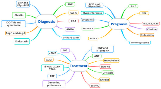 Biomarkers with a possible role in the diagnosis, prognosis, and treatment of PAH. BNP and NTproBNP (bone natriuretic factor and N-terminal pro-B-type natriuretic peptide), ANP (atrial natriuretic peptide), Cys C (cystatin-C), ET-1 (endothelin-1), ADMA (asymmetric dimethylarginine), Urinary cGMP (urinary cyclic guanosine monophosphate), Ang-1 and Ang-2 (angiopoietin-1 and angiopoietin-2), IDO-TMs (indoleamine 2,3-dioxygenase (IDO)-dependent tryptophan metabolites), ST2 (suppression of tumorigenicity 2), IL6, IL8,IL10 (interleukin-6, interleukin-8, interleukin-10), FSTL3 (follistatin-like 3), SNO-Hb (S-nitrosohemoglobin), sCD40L (soluble CD40 ligand), CRP (C-reactive protein), β-NGF, CXCL9, TRAIL (beta nerve growth factor; C-X-C motif chemokine ligand 9; TNF-related apoptosis-inducing ligand), ADM (adrenomedullin), cGMP (cyclic guanosine monophosphate), NO (nitric oxide).