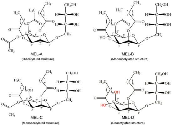 Biosurfactants are amphiphilic compounds synthesized by plants, bacteria, and filamentous fungi as secondary metabolites, are becoming increasingly popular in industrial production, and have the potential to replace fossil-driven surfactants [1,2,3,4,5,6]. According to their chemical properties, biosurfactants can be divided into five main categories: lipopeptides, fatty acids, biopolymers, phospholipids, and glycolipids [7,8]. Mannosylerythritol lipids (MELs) are the most promising natural glycolipid biosurfactants due to their unique properties, including non-toxicity, easy biodegradability, environmental compatibility, and pharmacological activities [9,10,11,12,13,14]. MELs are chemically composed of mannose, erythritol residue, and two fatty acids chains. Their chemical structures vary based on the number and position of the acetyl group on mannose and erythritol, as well as the length and saturation degree of fatty acid chains [10,15,16]. According to the degree of acetylation at C4 and C6 positions on mannose, MELs are classified into four typical homologues including MEL-A (diacetylated at mannosyl C-4′ and C-6′), MEL-B (monoacetylated at mannosyl C-6′), MEL-C (monoacetylated at mannosyl C-4′), and MEL-D (deacetylated) (Figure 1) [10,12,15,16,17]. The unique structures and features of different MELs expand their applications in various industries such as nanomaterials, bioscience, macromolecular chemistry, cosmetics, and medicines.