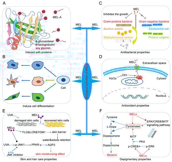 Recently, researchers have found that MELs also have depigmentation properties, which have potential application value in skin whitening, freckle removal, and other aspects. In 2019, the potential depigmentation effect of MELs was tested in primary normal human melanocytes (NHMs), α-melanocyte-stimulating hormone (MSH)-stimulated B16 cells (mouse melanoma cells), and human skin equivalent cells (MelanoDerm), and it was revealed that MELs significantly inhibit melanin synthesis in NHMs and α-MSH-stimulated B16 cells and exert clear whitening effects on human melanocytes and a 3D human skin equivalent [102]. Further, to investigate the molecular mechanism of MELs against melanin production, the inhibitory effect on tyrosinase activity was tested and the expression levels of melanogenic enzymes (tyrosinase, Tyrp-1, and Tyrp-2) were examined in MEL-treated NHMs, and the results suggest that MELs significantly suppress melanin-producing enzymes through inhibition of the ERK/CREB/MiTF signaling pathway [102] (Figure 2F). Based on the decolorization effect of MEL, researchers have been exploring its applications in cosmetics, pharmaceuticals, and other fields [10,17,92]. In the cosmetics industry, MEL can be added as a whitening ingredient to skin care products [102], helping to improve skin color and make the skin fairer and more radiant. In the pharmaceutical field, MEL can be used to treat skin diseases caused by melanin deposition, such as melanosis and freckles [103]. In addition, MEL can also be used to treat some diseases related to melanogenesis, such as melanoma [31,104]. However, research on the decolorization effect of MEL is still in its early stages, and there are still many problems that need to be solved urgently. For example, is the decolorization effect of MEL applicable to all populations? How safe and effective is its long-term use? The answers to these questions still require further research and exploration.