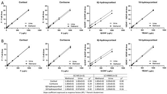 - Benzi, J.R.L.; Moreira, F.L.; Marques, M.P.; Duarte, G.; Suarez-Kurtz, G.; Lanchote, V.L. A background subtraction approach for determination of endogenous cortisol and 6β-hydroxycortisol in urine by UPLC-MS/MS with application in a within-day variability study in HIV-infected pregnant women. J. Chromatogr. B Analyt Technol. Biomed. Life Sci. 2020, 1144, 122074. [Google Scholar] [CrossRef]