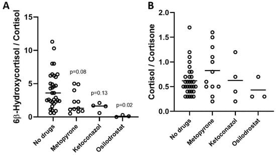 - Vega-Beyhart, A.; Laguna-Moreno, J.; Díaz-Catalán, D.; Boswell, L.; Mora, M.; Halperin, I.; Casals, G.; Hanzu, F.A. Ketoconazole- and Metyrapone-Induced Reductions on Urinary Steroid Metabolites Alter the Urinary Free Cortisol Immunoassay Reliability in Cushing Syndrome. Front. Endocrinol. 2022, 13, 833644. [Google Scholar] [CrossRef]