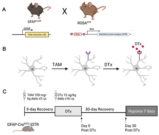 Experimental design. (A) Breeding scheme to generate the GFAP-CreERT2:Rosa26iDTR mouse line. (B) Administration of TAM induces the translocation of the CreERT2 protein, removing the upstream stop codon from the Rosa26iDTR gene, inducing the expression of a variant DTR, resulting in sensitivity to the DTx toxin in astrocytes. (C) Timeline of treatments for all experiments. Arrows indicate tissue collection time points for all experiments, with Day 0 post DTx, Day 30 post DTx, and hypoxic groups.