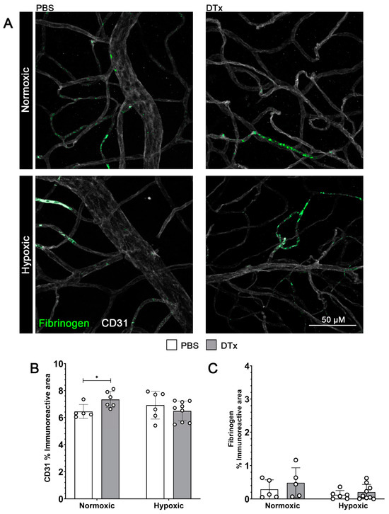 Both astrocytes and Müller glia directly interact with retinal vasculature and are involved in processes such as VEGF signaling, which is associated with angiogenic responses [29]. We next tested the hypothesis that increased macroglia reactivity would correlate to increased vascular pathology. Here we quantified vascular damage by quantifying the extravasation of the blood clotting factor fibrinogen (green) into retinal tissues (Figure 3A) [12]. To quantify the changes in retinal vascular structures, tissues were stained with CD31 (Figure 3A). While we did observe an increase in the CD31 immunoreactive area in normoxic control tissues in response to DTx, we did not observe significant differences between the other conditions (PBS normoxic 4.582 ± 1.06%, PBS hypoxic 5.42 ± 2.101%, DTx normoxic 7.289 ± 2.29%, DTx hypoxic 6.486 ± 0.645%, PBS normoxic vs. PBS hypoxic Mann–Whitney T-test p = 0.4286, DTx normoxic vs. DTx hypoxic Mann–Whitney T-test p = 0.0663, PBS normoxic vs. DTx normoxic Mann–Whitney T-test p = 0.0303, PBS hypoxic vs. DTx hypoxic Mann–Whitney T-test p = 0.4559) (Figure 3B). We observed no increase in fibrinogen accumulation in response to either hypoxic conditions or DTx administration (PBS normoxic 0.36 ± 0.0247%, PBS hypoxic 0.174 ± 0.153%, DTx normoxic 0.439 ± 0.152%, DTx hypoxic 0.125 ± 0.364%, PBS normoxic vs. PBS hypoxic Mann–Whitney T-test p = 0.4286, DTx normoxic vs. DTx hypoxic Mann–Whitney T-test p = 0.1469, PBS normoxic vs. DTx normoxic Mann–Whitney T-test p = 0.9307, PBS hypoxic vs. DTx hypoxic Mann–Whitney T-test p = 0.3636) (Figure 3C). These results suggest that neither DTx, hypoxia, nor the combination of the two induce vascular damage in retinal tissue.