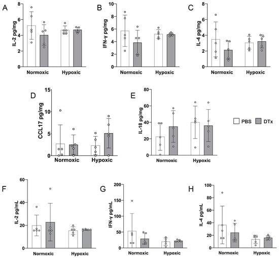 We next sought to test for changes in pro-inflammatory and anti-inflammatory mediators induced by the DTx treatment or hypoxic conditions. We utilized both protein lysate from brain tissue to examine CNS-specific responses and peripheral blood serum to measure systemic responses. We quantified the levels of pro-inflammatory cytokines IL-1β, IL-2, IL-6, IFN-γ, and TNF-α; anti-inflammatory cytokines IL-4, IL-5, IL-10, and CCL-17; the microglia proliferation marker GM-CSF; and the hypoxia inducible factor 1a regulating IL-18 (Table 2) to allow for an assessment of broad inflammatory and anti-inflammatory responses. Serum samples were also used to determine the systemic effects of hypoxia [31]. The brain and serum samples showed similar patterns of expression, with a higher concentration of cytokines detected in the serum. We did not detect changes in pro-inflammatory cytokines in blood or brain samples in response to a DTx or hypoxic treatment (Figure 5 and Table 2). We also found no changes in anti-inflammatory mediators, hypoxic response IL-18, or microglia proliferation marker GM-CSF (Figure 5 and Table 2). These data suggest that neither the DTx treatment nor hypoxia alter the immunomodulatory proteins tested in this study.