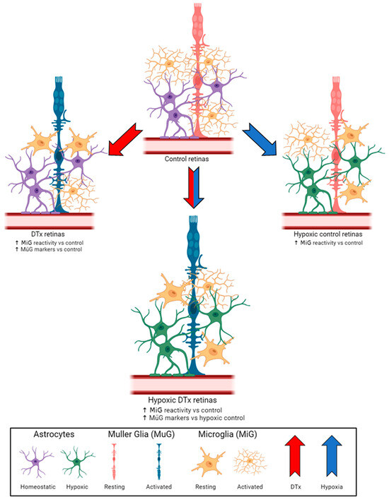 The vascular, microglial, and neuronal pathology seen does not support the alternative hypothesis that DTx-induced reactive astrogliosis exacerbates an inflammatory, hypoxia-induced retinal pathology. Instead, our data reveal a more complex signaling between the astrocytes, Müller glia, and microglia that needs further investigation. This could be further explored by examining the astrocyte responses to hypoxia when the microglia response to inflammation is modulated, in genetic models of FKN or CX3CR1 deficiency. Additionally, the mechanism of astrocyte-mediated Müller glia responses warrants further investigation to discover new potential avenues for therapeutic intervention not only in the context of DR but also other retinal diseases, given the ubiquitous involvement of the Müller glia in retinal pathology [27]. Treatments for DR are limited, focusing on controlling angiogenesis and glucose levels; thus, understanding the contribution of reactive astrocytes to the vascular unit under normal and hypoxic conditions holds promise for potentially identifying new glial signaling pathways that could become new therapeutic targets [43].