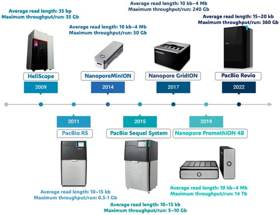 In short, even if NGS methods had completely transformed the way we deal with molecular biology nowadays, in recent years, the pressing need to overcome the abovementioned issues made scientists develop a novel methodology that marked the beginning of a new era in sequencing. It is called third-generation sequencing (TGS) and is characterized by improved sequencing chemistry, leading to real-time sequencing and the production of long reads that currently have an average length of more than 10 kb. This is a crucial property aimed at enhancing the quality of genome assembly and the analysis of genomic structures, such as the characterization of large insertions, deletions, translocations, and other structural changes that may exist throughout genome reads. TGS is in general characterized by single-molecule sequencing; this feature makes TGS fundamentally different from clonal-based NGS methods since it enables sequencing DNA or RNA that bypasses the PCR amplification step and, consequently, its potential biases [7]. The first TGS technologies were developed in 2009 with the HeliScope platform launched by Helicos Bioscience, Cambridge, MA, USA (Figure 1).