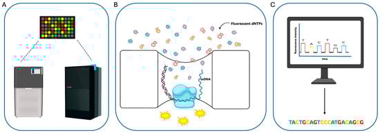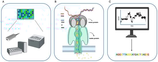 The categories of nanopores used in nanopore technology can be divided into solid-state and biological nanopores: the solid-state nanopores, composed of Si3N4 and SiO2, are the most widely used, whereas biological nanopores are usually produced by selected bacteria, such as α-hemolysin pore proteins MspA from Mycobacterium smegmatis, Phi29 from Bacillus subtilis, and CsgG from Escherichia coli [15]. The nanopores are arrayed in microscaffolds to increase their stability: each of them corresponds to their own electrode connected to a channel within the sensor chip, which enables the measure of the electric current that flows through the nanopore. Indeed, a molecule passing through a nanopore disrupts the electric current, producing a characteristic so-called “squiggle” (Figure 4B). The latter is then associated with a specific nucleotide using a base-calling algorithms in order to determine the real-time sequencing of that molecule (Figure 4C) [16].