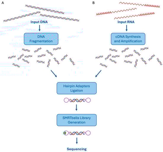 PacBio library preparation workflows: Using genomic DNA as starting material, the first step of the library preparation procedure is represented by DNA fragmentation. Then, DNA fragments are hairpin ligated to obtain an SMRTbell library suitable for polymerase binding and sequencing (A). Full-length mRNAs can also be used as an input sample. Indeed, the mRNAs are retro-transcribed, amplified, and hairpin ligated. The obtained SMRTbell library is ready for sequencing (B).