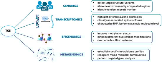 By sequencing thousands of bases with progressively greater accuracy and reducing costs, long-read technologies are becoming even more useful in resolving traditionally difficult-to-map genes or genome regions, such as highly repetitive elements, identifying co-inherited alleles, or getting information about haplotypes, as well as identifying de novo mutations and generating long reads for de novo assembly [5]. Moreover, TGS is making a revolution in omics research, allowing new discoveries in many fields of application, as is reviewed in the next sections (Figure 6).