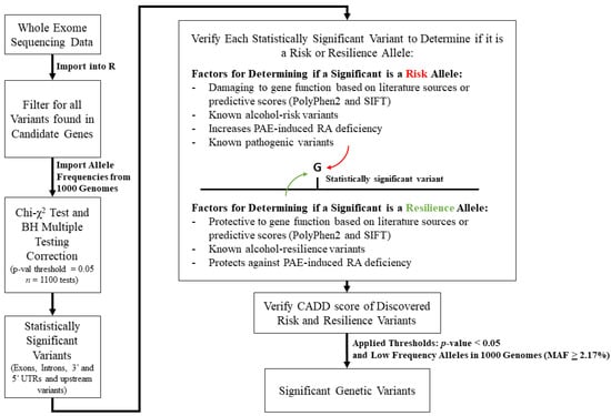 Figure 1. Flow chart of bioinformatic pipeline and determination factors considered for assigning risk and resilience alleles of genetic variants in the whole exome sequencing data of the FASD cohort. Once variants were imported into R, only variants found in our candidate genes were taken for analysis. This was followed by a chi-squared test using the 1000 Genomes Project allele frequencies as controls, which was followed by Benjamini–Hochberg multiple testing correction. Each variant was then sequentially determined to be an FASD risk or resilience allele based on defined criteria (literature sources and predictive scores) as seen in the Supplementary Tables. The CADD scores of discovered risk and resilience alleles were then investigated. Lastly, thresholds were applied at p-values < 0.05 and for low-frequency alleles in 1000 Genomes, and only significant genetic variants passing thresholds are shown in the results tables.