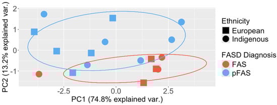 Statistically significant variants were grouped as follows: those unique to individuals with FAS, pFAS, or ARND and those significant variants that were common to both FAS and pFAS individuals (the two diagnostic categories that share clinical sentinel facial features) (see Supplementary Table S9). For genetic variants shared by both FAS and pFAS, the number of risk alleles in a given gene per person was determined, and this number was included in the represented major PAE-implicated pathway (RA, SHH, WNT, FGF, TGF- β, RAS-MAPK, RHO-RAC, and mTOR). The following operations were then applied: (1) If one variant in a gene was common to pFAS and FAS, other variants within that common gene were included. (2) Variants found in common to all three diagnostic groups were not included. (3) If a gene was found to not interact with any of the developmental pathways, then variants within that common gene were also not considered. The total number of risk alleles per pathway was compiled and then plotted using principal component analysis (PCA) using R software (version 4.1.2) to determine the degree of separation between FAS and pFAS diagnostic groups.