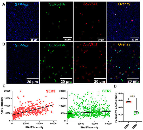 Co-staining the viruses with the anti-HA 568 antibody and AnxV allowed us to accurately locate particles positive for SER2 or SER5 and exposed PS, respectively. By selecting GFP-Vpr puncta utilizing a wavelet-based detection algorithm (detailed in Section 2), we determined per-particle intensities of SER2 or SER5 and AnxV (see Figure 2C). We then performed (Pearson’s) correlation matrix analysis, wherein the wide range of iHA and AnxV intensities obtained from imaging SER5 and SER2 viruses from each preparation was tested for correlation (Figure 2C,D, [54]). By performing this analysis for three independent biological replicates, we were able to obtain an average Pearson’s coefficient (r) for both SER5 and SER2 samples: ~0.58 vs. ~0.23, respectively. This indicates that SER5 incorporation correlates better with enhanced PS exposure, both with regard to the overall median intensity values of independent preparations (Figure 1F) and on a per-particle basis (Figure 2C,D).