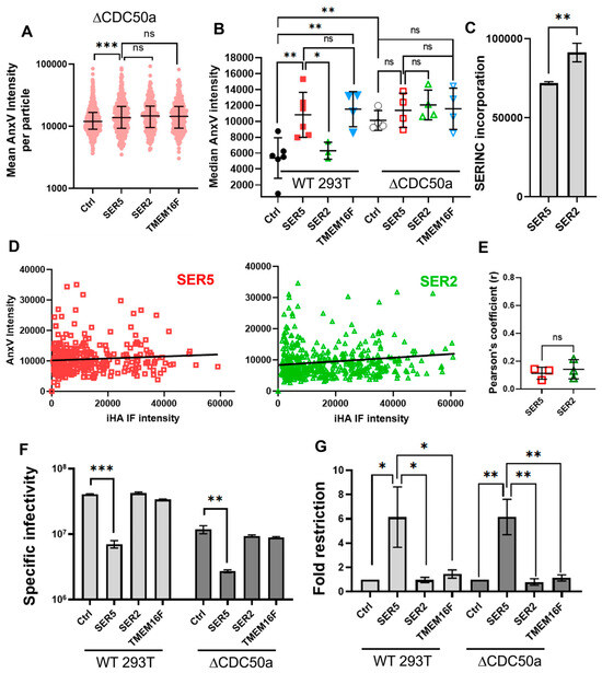 Pseudoviruses produced by ΔCDC50a cells are restricted by SER5 despite a higher baseline level of external PS. (A) Representative scatterplot showing mean AnxV intensities of single viral particles (N > 100). (B) Median AnxV intensity values from 4 independent pseudovirus preparations produced by ΔCDC50a cells are plotted. Each symbol represents an independent biological replicate. For ease of comparison, the median AnxV intensity distribution for viruses produced by WT 293T cells is replotted from Figure 1D. The horizontal lines on both (A,B) represent the median value, while the error bars represent the interquartile range. Symbols from (B) denote the median intensity value from each biological replicate. (C) Representative IF intensity from SER5 and SER2 samples showing overall levels of iHA incorporation. (D) Representative correlation scatterplot of AnxV intensities and iHA IF intensities from single viral particles produced from ΔCDC50a cells. (E) Pearson’s coefficient values (symbols) were obtained from analyzing correlation scatterplots from three independent biological replicates exemplified in (D). The horizontal line represents the mean and error bars of the S.D. (F) Representative luciferase reporter assay readings showing the difference in infectivity of viruses produced from WT and ΔCDC50a cells. Specific infectivity was plotted as the luciferase signal per ng of the p24 virus under each condition. (G) Fold infectivity reduction relative to the Ctrl samples was plotted as the fold restriction from 5 (WT 293T viruses) and 6 (ΔCDC50a viruses) independent biological replicates. The bars and the error bars represent the mean value and S.D., respectively. Statistical analysis was performed using Student’s t-test. n.s., p > 0.05; *, 0.05 > p > 0.01; **, 0.01 > p > 0.001; ***, p < 0.001. Note that p > 0.05 is not acknowledged in (F,G) to aid visual clarity.