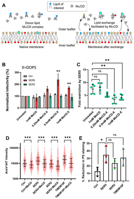 To test the functional effects of specific lipid exchange at the viral lipid envelope, we prepared three independent MαCD complexes (MαCD-X) comprising one of the three lipids denoted by X: (1) DOPS, (2) DOPC, and (3) DOPE. The virus samples were treated with 0, 0.25, 0.5, and 1 mM of the MαCD-X complex. In all lipid-exchange experiments, 1 mM of unloaded MαCD was included as a control. Treatment with MαCD-DOPS led to a nearly 200% increase in the infectivity of SER5-containing viruses (in other words ~2.5–3-fold reduction in restriction potency of SER5), while no effect was detected in control viruses (Figure 6B,C,E and Figure S9).