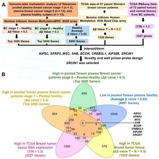 To identify novel potential biomarkers for early prediction and drug targets in breast cancer patients from both Taiwanese and Western cohorts, we have followed the present strategy to screen for targets: (1) genome-wide methylation profiling of pooled plasma from healthy Taiwanese individuals (n = 12), pooled plasma from Taiwanese Stage I breast cancer patients (n = 12) and pooled plasma from Taiwanese stage 0 breast cancer patients (n = 12), using the Infinium MethylationEPIC array; (2) analysis of methylation levels based on TCGA data for 87 paired samples from Western breast cancer patients; and (3) examination of TCGA RNAseq data for 72 paired tissue samples from breast cancer patients (Figure 1A and Supplemental Figure S1).