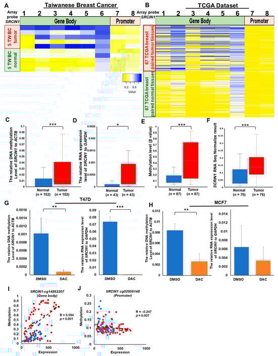 Heatmap of SRCIN1 methylation patterns and mRNA expression in the Taiwanese and TCGA cohorts and the correlation between methylation and expression levels. (A) Heatmap of the SRCIN1 methylation pattern in 5 breast cancer tissues from the Taiwanese cohort. (B) Heatmap of the SRCIN1 methylation pattern in 87 breast cancer tissues from the TCGA cohort. The highly differentially methylated sites cg14482902, cg01514828, cg03026373, cg14862207 and cg04194674 correspond to array probes 1, 2, 3, 4 and 5, respectively. The genomic positions of the QMSP amplicon are located in exon 1 (+906, +635, −78, −89 and −244) of the SRCIN1 gene. (C) Box plot of SRCIN1 methylation and (D) expression levels in 102 Taiwanese patient tissues. (E) Box plot of SRCIN1 methylation and (F) expression levels in 87 TCGA patient tissues. Methylation and mRNA expression levels were analyzed post-treatment with the solvent control DMSO and DAC in T47D breast cancer cells (G) and MCF7 breast cancer cells (H). The relative DNA methylation levels are shown in the left panel, and the relative mRNA expression levels are shown in the right panel. The data are presented as the mean ± SD; * p < 0.05; ** p < 0.01; ***p < 0.001. A t test was used to assess differences between groups in all experiments; the experiments were performed using at least two biological duplicates and three technical replicates. Pearson correlation analysis of DNA methylation and RNA sequencing data for 87 paired adjacent normal and cancer tissue samples in gene bodies region (I) and gene promoter regions (J). Red dots indicate tumor tissue, while blue dots signify normal tissue.