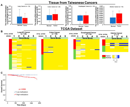 Cell-free DNA exhibiting irregular methylation patterns in body fluids could be considered a potential diagnostic and prognostic tool for managing breast cancer []. Nonetheless, while the FDA has granted approval for SEPT9 in the early detection of colon cancer, there is still a lack of FDA-approved methylation biomarkers for breast cancer screening []. Gene body methylation plays a pervasive role in the modulation of gene expression and is strongly correlated with both the initiation and progression of malignant tumors []. Several gene body methylation biomarkers specific to breast cancer have been previously reported [,,]. However, there is a widespread ongoing debate regarding the precise function of gene body methylation in gene transcription, and the majority of DNA methylation research has focused on CpG islands within gene promoter regions []. In the present study, we conducted a genome-wide methylation array analysis to detect hypermethylation at multiple CpG sites in SRCIN1 in breast cancer patients. Methylation array analysis and quantitative methylation-specific PCR (qMSP) confirmed an increase in the methylation level exceeding 50% at five CpG sites within SRCIN1 in tissue samples from breast cancer patients in both the TCGA and Taiwanese cohorts. Interestingly, SRCIN1 hypermethylation did not occur in other cancer types within the Taiwanese and TCGA datasets, confirming the usefulness of SRCIN1 as a biomarker specifically for breast cancer patients.