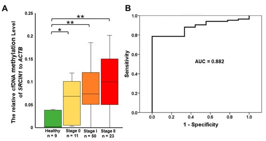 The levels of methylated circulating SRCIN1 showed a positive correlation with disease stage. The percentages of patients in the following groups who were positive for circulating methylated SRCIN1 were as follows: healthy (0%), stage 0 (63.6%), stage I (80%) and stage II (82.6%). Overall, the marker had a sensitivity of 78.5%, an accuracy of 90.3%, a specificity of 100% and an AUC of 88.2%. (Figure 4A,B; and Table 2).