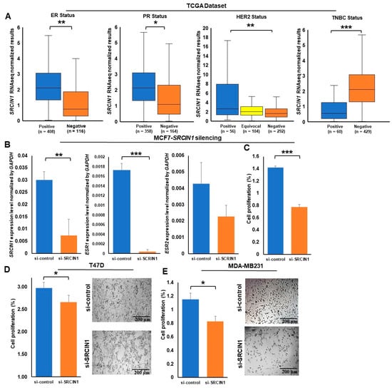 SRCIN1 expression in breast cancer cell proliferation and its correlation with hormonal receptor and HER2 status: (A) box plot of SRCIN1 expression levels correlated with ER, PR, HER2 and TNBC status data generated from the TCGA dataset; (B) ESR1 and ESR2 expression after knockdown of SRCIN1 in the MCF7 cell line; (C) the relative proliferation of MCF7 cells; (D) images of T47D breast cancer cell lines after transfection with si-SRCIN1 and the relative proliferation of T47D cell lines; (E) images of MDA-MB231 breast cancer cell lines after transfection with si-SRCIN1 and the relative proliferation of MDA-MB231 cell lines; GAPDH was used as an internal control. The data are presented as the mean ± SD; * p < 0.05; ** p < 0.01; *** p < 0.001. A t test was used to assess differences between groups in all experiments; the experiments were performed using at least two biological duplicates and three technical replicates.