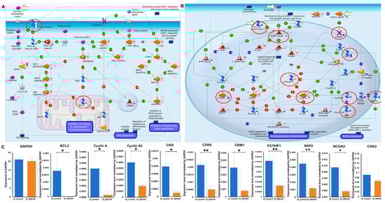 Network analysis of SRCIN1 involvement in estrogen receptor downstream signaling pathways and the cyclin protein family: (A) MetaCore analysis of estrogen receptor downstream signaling pathways and apoptosis; (B) RNA-seq; (C) RT‒PCR after transfection with si-SRCIN1 in MCF7 cells indicating decreases in Cyclin A, Cyclin A2, CKS, CDK6, CRM1, P27KIP1 SKP2, NCOA3 and CDK2. The data are presented as the mean ± SD; * p < 0.05; ** p < 0.01. A t test was used to assess differences between groups in all experiments.