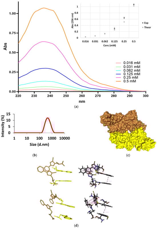 Plot of UV Absorbance against concentration of compound aggregation (a). DLS analysis of compound 5 in PBS 1X pH 7.4 at room temperature (b). Model of an aggregate formed by 512 molecules of compound 5. Note the presence of a cavity within its interior (c). Two 3D pose views of the tetrameric complex formed by the coplanar dimer (yellow) and the ring-staggered dimer (brown), with interaction types highlighted in purple (π-π stacking) and grey (carbon–hydrogen bond). Note how the carbon–hydrogen bond holds together the two dimeric structures into the tetramer and how the stacking also occurs in the staggered dimer (d).