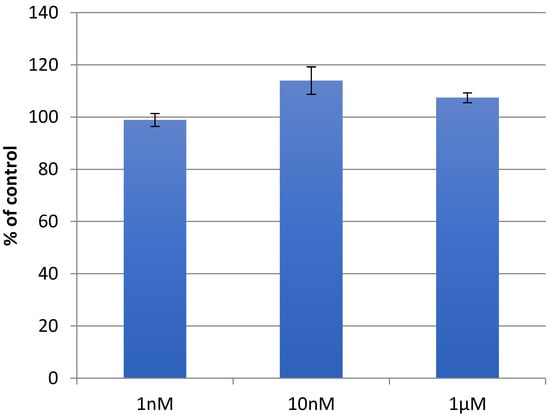 Growth of HDF fibroblasts (%) with 1 nM, 10 nM, and 1 μM concentrations of compound 5. Control corresponds to vehicle-treated cells.