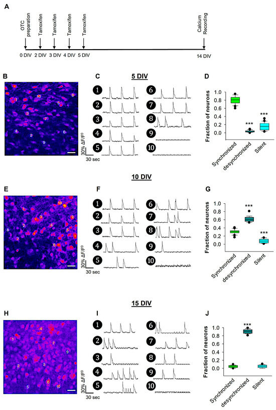 Eliminating reelin during embryonic development affects cortical layer lamination [58]. However, after birth, when neurons have already migrated and settled into their proper layers, elimination of reelin does not affect cortical lamination. In a previous study, we found that conditional elimination of reelin after birth did not alter the distribution of layer-specific expression markers in the neocortex, thus preserving cortical layers [59]. To bypass the cortical layer malformations present in the reeler mutant, 4-OHT was added to the culture medium of OTCs from 2 DIV for 4 consecutive days to induce reelin deficiency. To investigate developmental network desynchronization in the mouse somatosensory cortex, we recorded Ca2+ activity in spontaneously active OTC at different developmental time windows: 5, 10, and 14 DIV (Figure 1). Imaging large networks of neuronal populations loaded with the calcium indicator OGB-1 using a spinning-disk confocal microscope equipped with fast cameras, can be used to image thousands of neurons simultaneously without significant photobleaching, with good signal-to-noise ratio, and minimal cellular damage [56,60]. This technique does not require electrodes penetrating the tissue, minimizing cellular damage. Ca2+ recording of OTCs loaded with the calcium indicator OGB-1 showed a synchronous neuronal activity pattern in the wt OTC at 5 DIV (Figure 1B–D). Around 80% of cortical neurons displayed synchronous neuronal activity at that stage, 5% of the neurons showed desynchronized activity, and the remaining 15% were silent. At 10 DIV, there was an increase in the percentage of neurons exhibiting desynchronized activity (60%, Figure 1E–G). By 14 DIV, 90% of recorded cortical neurons of wt cultures exhibited desynchronized activity, making it the dominant form of neuronal activity during this developmental time window (Figure 1H–J). The observed developmental desynchronization pattern in the somatosensory cortex in this study was comparable to neuronal activity patterns which were previously reported in in vivo studies. Similar patterns were reported in mice by [20] around P13 and by [23] at P14, while similar patterns in rats were reported by [21] between P25 and 36 and by [22] between P21 and 30.