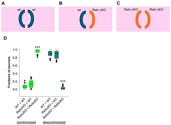 Neuronal desynchronization in RelncKO OTCs is rescued by secreted reelin. Schematic representation of the co-culture experimental approach. (A): Two co-cultured wt OTCs. (B): A wt OTC co-cultured together with a RelncKO OTC. (C): Two co-cultured RelncKO OTCs. The fraction of neurons participating in synchronized and desynchronized neuronal activity is represented in the box plot in the graph (D). Statistical analysis was performed using one-way ANOVA on ranks followed by Tukey’s multiple comparison test, with a significance level of *** p < 0.001. For this analysis, we used a total of 32 OTCs from wt and 36 OTCs from RelncKO mice. Note that the fraction of synchronized and desynchronized neurons recorded from RelncKO, which were co-cultured with wt OTCs, showed no difference from the wt OTCs that were co-cultured with wt OTCs. The Mann–Whitney U test was used for statistical analysis, and the results showed *** p < 0.001.