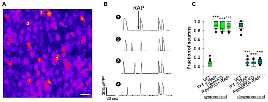 We further aimed to test whether the shift in developmental desynchronization defect observed in the RelncKO neurons is modulated by canonical reelin signaling. To address this question, we treated OTCs with RAP, an LDL receptor family chaperone that prevents the binding of reelin to VLDLR and ApoER2. Reelin regulates DAB1 tyrosine phosphorylation by binding to VLDLR and ApoER2 [45]. To test whether reelin signaling is involved in the developmental desynchronization shift, we performed Ca2+ imaging in wt and RelncKO OTCs and recorded neurons before and after bath application of RAP (50 ng/mL). At 14 DIV, wt OTCs displayed a desynchronized neuronal activity pattern; however, the bath application of RAP induced neuronal synchronization (Figure 4C; see also Supplementary Movie S3). In contrast to wt OTCs, neither the proportion of synchronized nor desynchronized neurons was affected by the application of RAP to RelncKO OTCs (Figure 4C). These results suggest that blocking endogenous reelin signaling with RAP at the end of the second week results in a developmental desynchronization defect for cortical neurons.