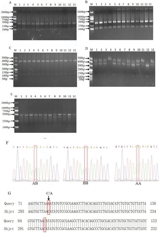 Enzymatic cleavage and sequencing of the NRAMP1 genes of Shanghai white pigs, Fengjing pigs and Shawutou pigs showed only BB genotypes; therefore, their genetic polymorphisms were not analyzed in this study. The PIC values of Meishan pigs and Pudong white pigs were in the range of 0.25–0.5; both were moderately polymorphic, and neither satisfied the Hardy–Weinberg equilibrium. In this study, we found that the Meishan pigs’ and Pudong white pigs’ NRAMP1 genes had a high Ho, which suggests that the genetic diversity of the two breeds is more abundant. This may be due to the fact that some properties of heterozygous individuals are higher than those of pure individuals. This also makes the pure individuals gradually eliminated during long-term natural selection and artificial breeding, while the heterozygous individuals are retained more. The PIC indicated moderate polymorphism, which further indicated that intron 6 polymorphism of the NRAMP1 gene was not abundant in the two pig breeds.