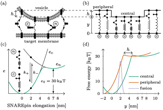 The docked dual-ring SNAREpin machinery consists of two ensembles of SNAREpins forming distinct rings, hereafter called the central and the peripheral rings, around the fusion point (see Figure 1a). Within each ring, the SNAREpins are arranged in parallel: the intermembrane distance is the same for all the elements within the same ring (see Figure 1b). The intermembrane distance of the central ring—closest to the target membrane—is denoted by y for this ring. For the SNAREpins constituting the peripheral ring—farther from the target membrane– the intermembrane distance is increased by a vertical shift . The number of SNAREpins is denoted by and in the central ring and the peripheral ring, respectively.