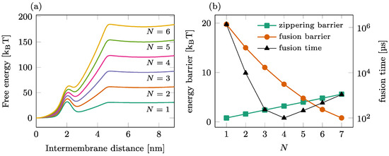 The fusion process mediated by a single ring of a SNAREpin is illustrated in Figure 2. The total free energy landscape is represented for various numbers of SNAREpins in Panel (a), and the corresponding zippering and fusion barriers are shown in Panel (b) (left axis). As increases, the fusion barrier reduces (circles) as more SNAREpins can exert more force on the two membranes. In contrast, the zippering barrier increases (squares) with , showing that the synchronization of the individual zippering events requires more time for large groups of SNAREpins. A detailed analysis of this phenomenon can be found in [27]. The result of these antagonist dependences is the optimal number of SNAREpins, leading to an overall average fusion time of ~100 μs, as presented in [22].
