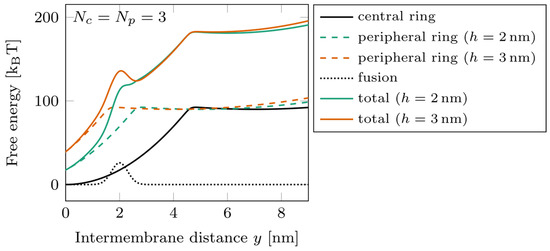 If we compare the energy barrier with and without the peripheral ring (dashed vs. solid lines in Figure 4), we find that for the low vertical shift, the presence of the second ring is detrimental to the zippering process. The fusion process is, however, almost always facilitated by the peripheral ring, except in a short interval around , where the fusion energy barrier is larger with the peripheral ring than without.