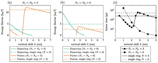 The effect of the shift on the fusion time is illustrated in Figure 4 for and . We first observed that the barriers do not necessarily exist for all vertical shifts as the graph interruptions in (a) and (b) signal. For instance, the zippering barrier is removed beyond of the shift for ; see (a) solid green line. The main observation is that the dependence of the fusion energy barrier on the vertical shift is non-monotone, showing a steep increase by a few kBT between and , especially in the case of . Consequently, the fusion time also increases in this interval by around one order of magnitude for [circles in (c)]. We do not observe this effect for since the increase of the fusion barrier is less pronounced; see (b).