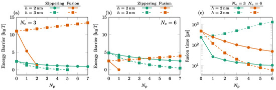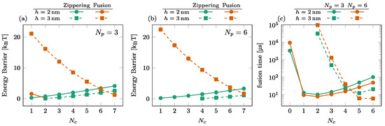 The dependence of the energy barriers and the fusion time on the number of SNAREpins in the central ring is illustrated in Figure 6. The effect of is most noticeable in the fusion barrier for [orange squares in (a) and (b)], showing a rapid decrease with . For , the fusion barrier is cancelled by the addition of one or two SNAREpins in the peripheral ring [circles in Figure 5a,b]. In this case, the effect of is visible only in the increase of the zippering barrier. The consequence on the overall time of fusion is the rapid decrease observed with the addition of a single central SNAREpin corresponding to the disappearance of the fusion barrier and a subsequent slower increase in the fusion time due to the progressive increase of the zippering barrier with ; see circles in Figure 6c.