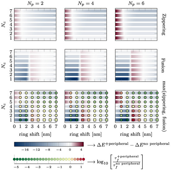 The effect of the presence of the external ring on the energy barriers characterizing the kinetics of the fusion process and the fusion time is summarized in Figure 7. The two upper lines show the change in energy of the zippering (first line) and fusion barrier (second line) in kBT. A blue color indicates that the energy barrier is reduced by the peripheral SNAREpins. A dark red color indicates that the energy barrier is increased by the peripheral SNAREpins. The last line shows the change in the maximum energy barrier in the total energy landscape and the change in fusion time on a logarithmic scale. Green disks indicate accelerated fusion time, and red disks correspond to slower fusion times. It is worth noting that increasing one of the barriers may still lead to a more favorable energy landscape and accelerated fusion times because the other barrier is reduced enough. For instance, for five central and six peripheral SNAREpins, which is close to the expected physiological values, and a vertical shift of 3 nm, the fusion barrier is increased by approximately 4 kBT, but the maximum barrier of the overall energy landscape is reduced by 1 kBT, and the fusion time is accelerated 100 times.
