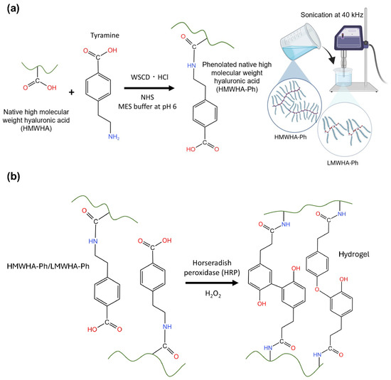 Schematic illustrations of (a) HA-Ph synthesis and degradation by sonication of HA-Ph solution to obtain LMWHA-Ph. (b) Hydrogel preparation method using HRP-mediated crosslinking of phenolated HMWHA-Ph or LMWHA-Ph in the presence of H2O2.