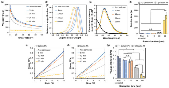 Effect of sonication time on the (a) viscosity of HA-Ph solution and (b) molecular weight of HA-Ph. The stability of phenol groups with sonication time represents the fluorescence emission of the (c) diphenol bond at excitation at 310 nm. The effect of sonication time on the mechanical properties of HA-Ph hydrogels with and without gelatin-Ph is represented as (d) gelatin time and (g) Young’s modulus calculated based on the (e,f) stress−strain curve at 1% to 10% strain. Error bars represent the standard deviation (n = 5) for Young’s modulus and (n = 3) for gelation time. * p < 0.05, n.s.: no significant difference (p > 0.05) in Tukey’s HSD.