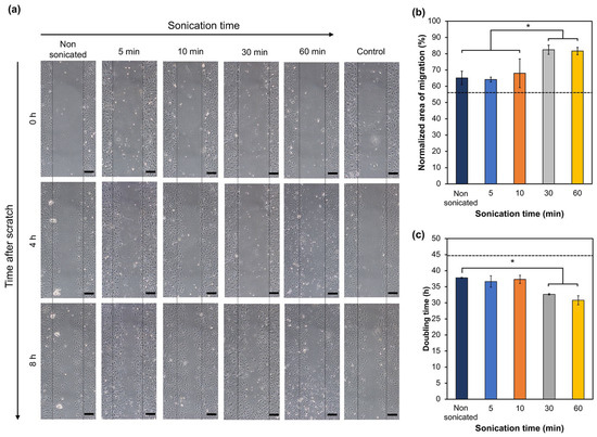 Impact of medium containing degraded HA-Ph on HUEhT-1 cell migration and proliferation. (a) Time-lapse images captured at 0, 4, and 8 h after creating a scratch wound (scale bar 50 μm). (b) Quantitative analysis of the normalized area of cell migration as a percentage. Error bars represent the standard deviation (n = 3). (c) Doubling time of HUEhT-1 cells as a function of HA-Ph solution sonication time. Error bars represent the standard deviation (n = 2). Cells cultured without adding HA-Ph into the medium were considered the control, and the values are represented as the dashed line in the graphs. * p < 0.05, n.s.: no significant difference (p > 0.05) Tukey’s HSD.